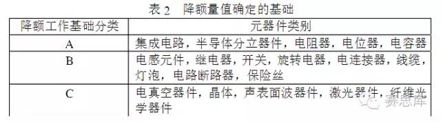 (3) 由于技術較新,或受到器件所在設備中組合方式的限制,至今尚無降額的應用數(shù)據(jù)可供參考。但研究了它們的結構和材料,作出降額的工程判斷(表2中的C類)。