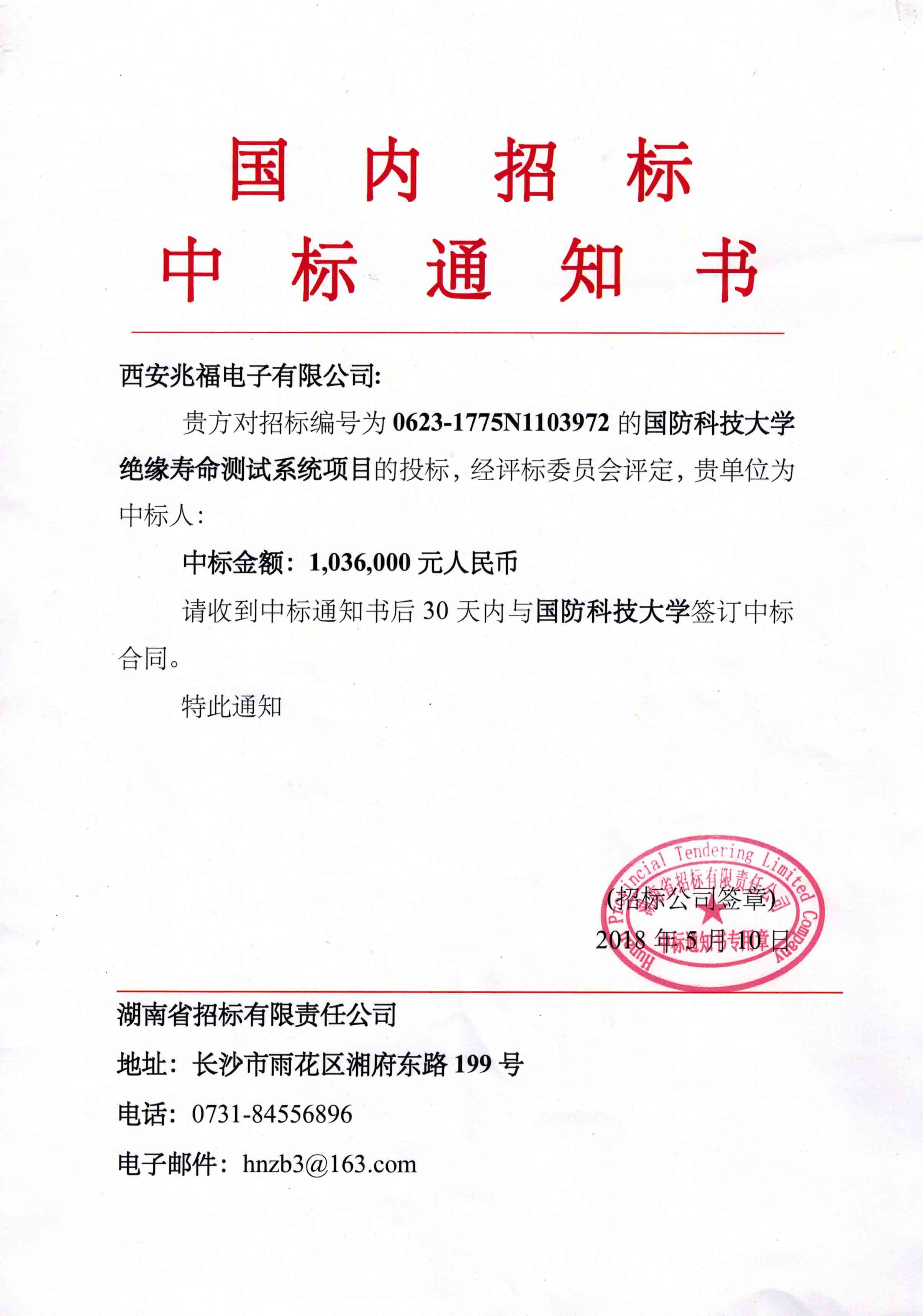 熱烈祝賀我公司中標(biāo)國防科技大學(xué)絕緣壽命測試系統(tǒng)項目