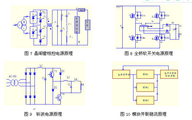 原理簡(jiǎn)圖如圖7所示;對(duì)于50KW以下的中小功率電源全部采用高頻開關(guān)技術(shù),主要采用全橋零電壓/零電流軟開關(guān)技術(shù)、斬波電源,工作原理見圖8。還有部分電源,特別是開關(guān)磁鐵電源,需要電源輸出電流在200ms的時(shí)間內(nèi)完成從0到額定值的轉(zhuǎn)換或從額定值到0的轉(zhuǎn)換,因此這部分電源采用高頻斬波技術(shù),該電路能夠有效吸收電流快速下降時(shí)磁鐵負(fù)載產(chǎn)生的反向電壓,工作原理見圖9。對(duì)于注入引出系統(tǒng)的低壓大電流電源采用多模塊并聯(lián)穩(wěn)流技術(shù),每個(gè)模塊實(shí)際上是一個(gè)自己閉環(huán)工作的小功率開關(guān)電源,輸出電流在100-250A,電壓為10-30V,根據(jù)電源輸出電流選擇不同規(guī)格和不同數(shù)量的模塊并聯(lián),所有模塊受一個(gè)總的調(diào)節(jié)器控制,工作原理見圖10。