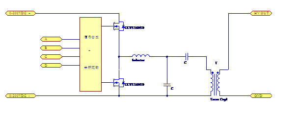 此部分功能是將輸入的0-200V直流電壓變換成0-200V的交流方波電壓,然后把0-200V(記為Ui)的交流方波電壓加到一個LC串聯(lián)諧振回路上,假定LC串聯(lián)諧振回路的品質(zhì)因數(shù)為Q,那么在交流方波的頻率f1接近或等于LC串聯(lián)回路的諧振頻率f0時在C上會得到一個高于輸入電壓的電壓(記為Uo1),其電壓值的大小為Uo1=Q*Ui,再把Uo1加到一個匝比為N的升壓變壓器上,從變壓器的次級輸出的電壓Uo直接供給負(fù)載其值大小為Uo=N*Uo1,這部分的電路原理圖如下: