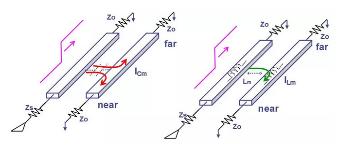 另外一方面,根據(jù)楞次定律,左面?zhèn)鬏斁€流經(jīng)電流發(fā)生變化引起磁通量的變化,被耦合到的右面的傳輸線形成反向電流,以阻礙入侵者磁通的變化。我們稱左面的為入侵信號或干擾源,右面的為受侵害信號,這樣的磁場耦合,形成互感。