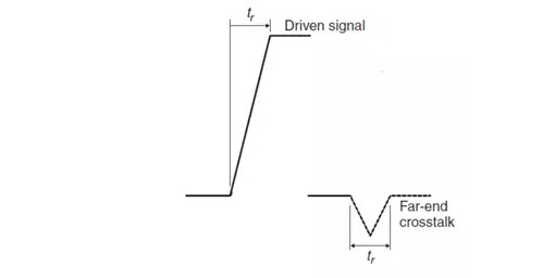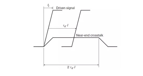 入侵階躍信號邊沿從源端開始傳輸,在受侵害鏈路形成反向傳輸波,一直到入侵信號抵達(dá)鏈路末端,受侵害鏈路反向傳輸波形在遠(yuǎn)端再經(jīng)過一個(gè)單程傳輸延遲傳到近端,這樣近端串?dāng)_形成的同向脈沖的寬度就是信號傳輸延遲的兩倍。