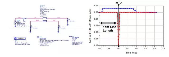 如果在入侵鏈路末端和受侵害鏈路的兩端都匹配端接,近端形成的是兩種串?dāng)_的同向疊加,幅度是正值,以微帶線為例,通常來說互感引起的耦合電流要更大,所以在遠(yuǎn)端疊加形成的串?dāng)_為負(fù)。