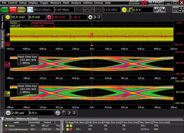 1高速鏈路間的串?dāng)_影響,我們打開遠(yuǎn)端串?dāng)_,利用N8834A分析工具(設(shè)置方法不此處贅述),將串?dāng)_源設(shè)定為串行信號,軟件計(jì)算出來碼型長度,理想碼型,以及計(jì)算出信號間的傳遞模型,計(jì)算出串?dāng)_源對受侵害信號幅度的影響程度為14%,信號自身的ISI影響約是14%,軟件將串?dāng)_源影響移出后,下圖屏幕中間的波形可以看到眼高和眼寬的結(jié)果和文章前面提到的原始沒有打開串?dāng)_條件下的波形是比較接近的,另外,分析工具也可以對由于ISI的影響移除后的理想波形,這里我就不再展示。