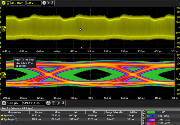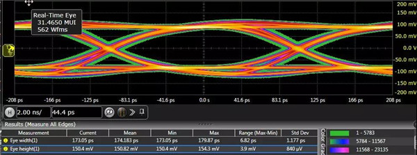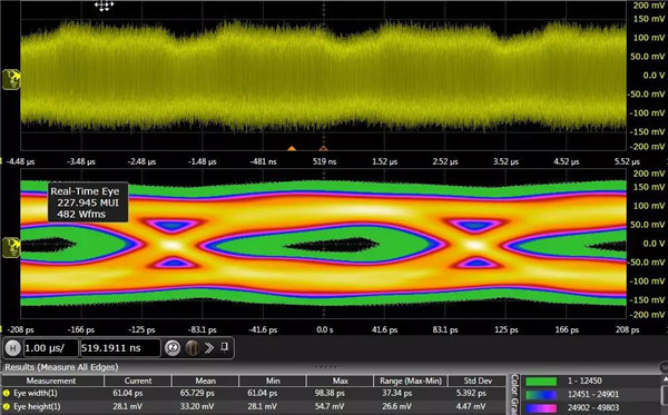 下圖是觀測鏈路中發(fā)出的5Gbps的信號,芯片打開了去加重,經(jīng)過10英寸左右走線,連接到示波器,我們可以看到在信號中測試的眼圖很清晰,為了簡化起見,我們以50%的位置測量眼高EH,以0電平threshold測試眼寬EW,直接從測量數(shù)據(jù)得到眼高眼寬,可以看到眼高和眼寬分別達(dá)150mv和173ps