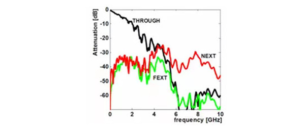 對于高速無源鏈路來說,從頻域表達(dá)的傳遞函數(shù)是對鏈路間串?dāng)_程度描述的一個(gè)常用的方法,我們可以通過網(wǎng)絡(luò)儀VNA測量鏈路間近端或遠(yuǎn)端的插入損耗,對電纜或者PCB上相鄰鏈路間,分別測量NEXT或FEXT,定量反映在鏈路間頻域的傳遞特性。