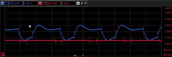 上面我們所說的都是考慮傳輸線之間的串?dāng)_,另外一方面,也要考慮電源紋波和噪聲等問題對高速鏈路影響,雖然不同于高速鏈路之間的電磁干擾,但因?yàn)殡娫丛肼暫图y波也會進(jìn)一步惡化信號的噪聲和抖動,所以我們也把這部分歸為廣義的串?dāng)_,下圖是使用電源軌探頭N7020A對Serdes IO供電電壓和PLL供電電壓的測量結(jié)果,可以看到電源上存在低頻紋波、跌落和高頻噪聲等現(xiàn)象